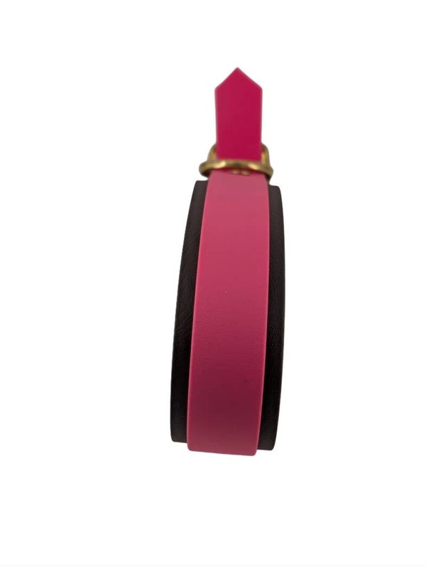 Biothane Halsband aus dunkelbrauner 3,8 cm breiter und pinker 2,5 cm breiter Biothane. Der Verschluß besteht aus einer Doppelstegschnalle aus Messing. Der Verstellbereich geht von 37 - 43 cm Halsumfang.
