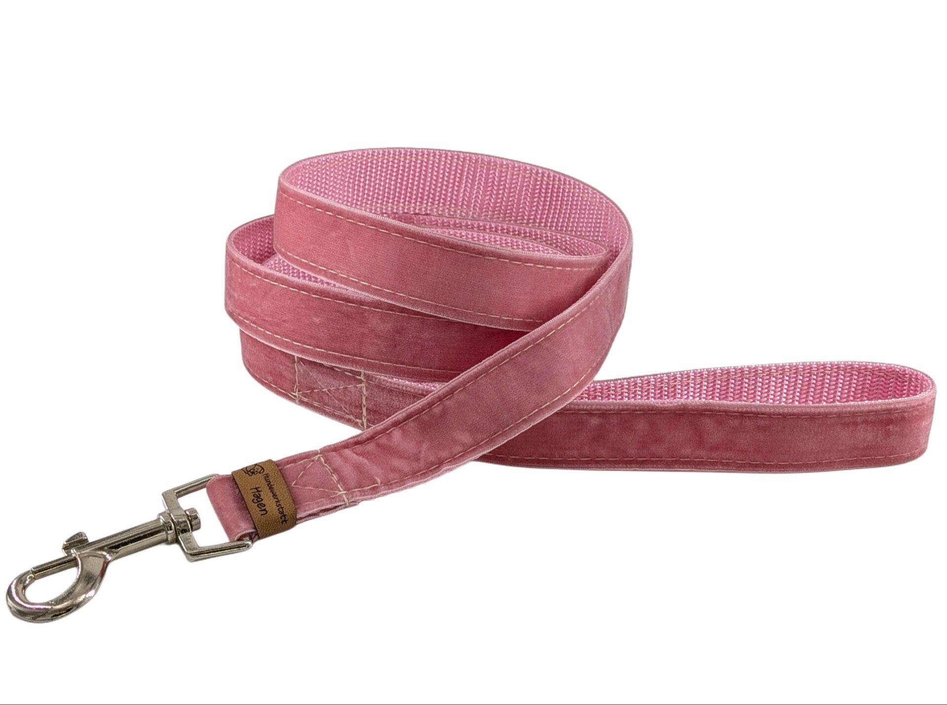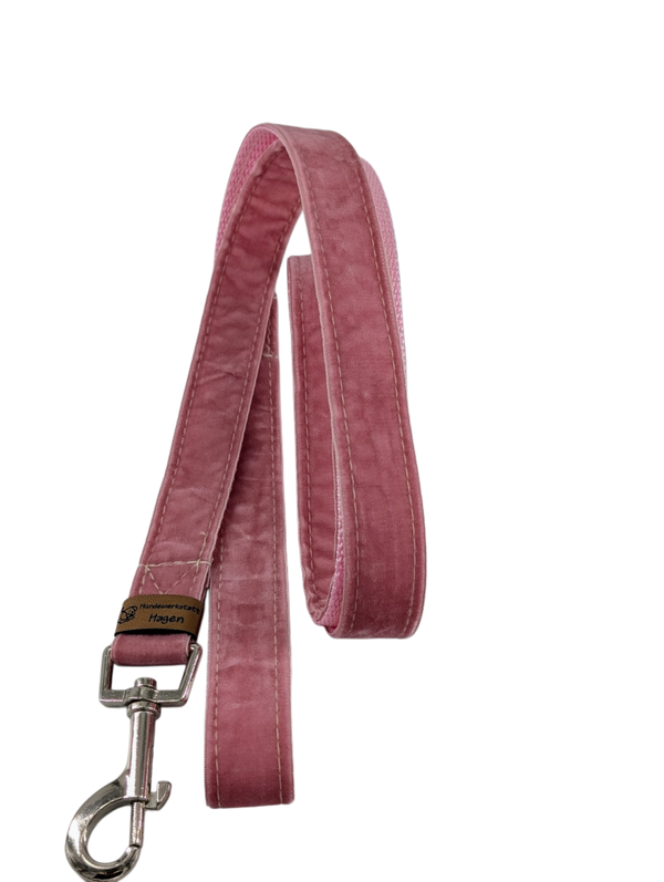 Samthundeleine/Cityleine: Länge 135 cm, Breite 25mm, feste Handschlaufe. Gurtband rosa - stärke 1,2 mm, Samt altrosa, Bolzenkarabiner silber
