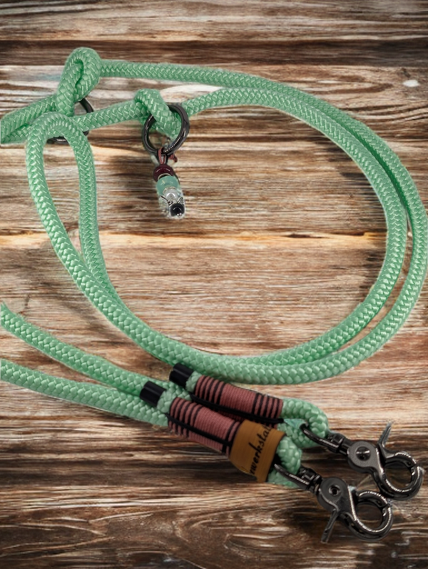 Diese schicke Hundeleine wurde aus PPM Seil in der frischen Farbe Mint angefertigt. Die Karabiner und Ringe sind in der Farbe Gunmetal und die Endkappen sind schwarz und stehen in tollem Kontrast zur Seilfarbe. Die Takelung besteht aus Microcord in den Farben schwarz und dunklem Altrosa.